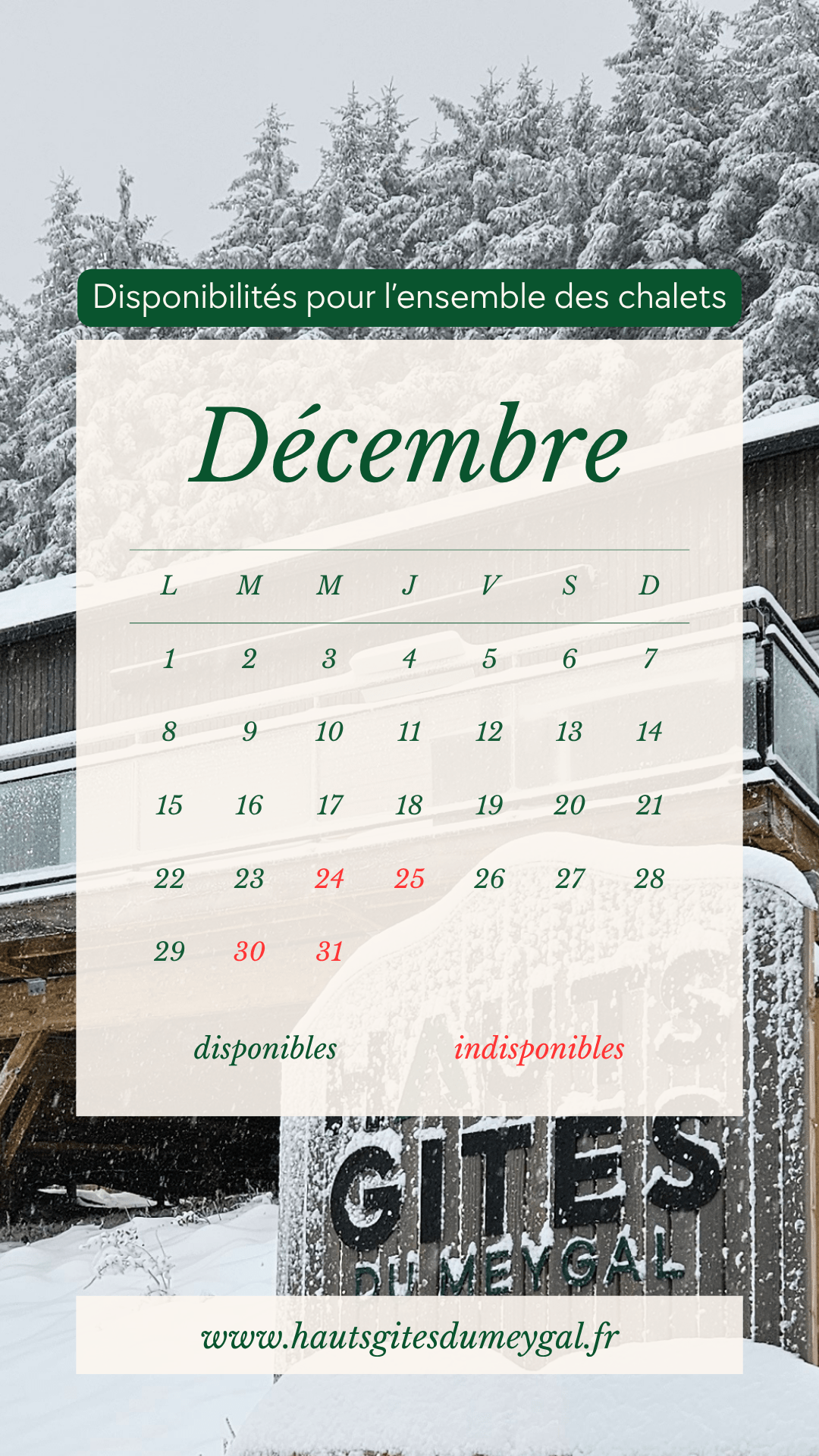Des créneaux sont encore disponibles (sur au moins un chalet) pour profiter d’un séjour magique sous la neige ou d’un moment de calme au cœur de l’hiver.
