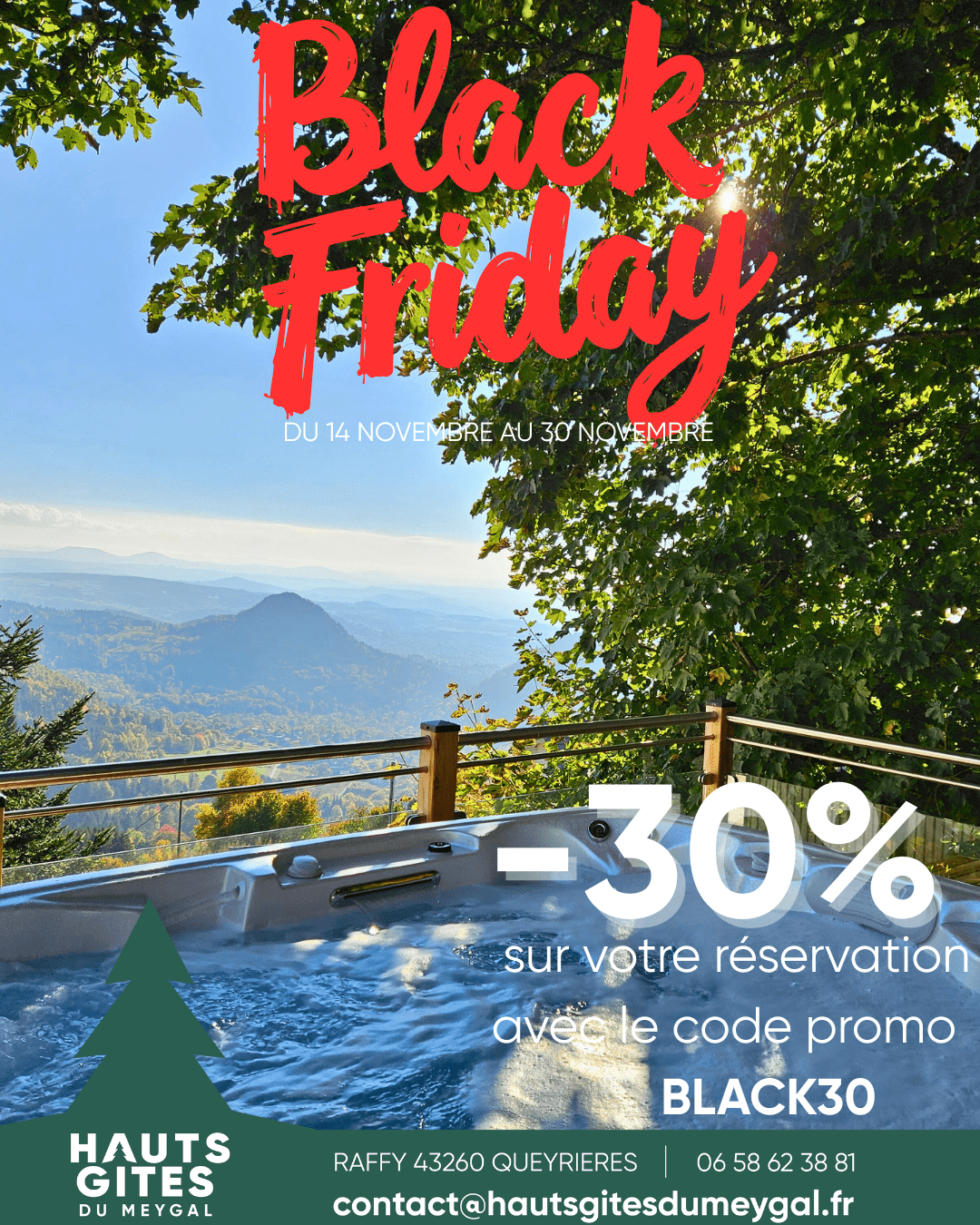 Pour le Black Friday, les Hauts Gîtes du Meygal vous offrent 30% de réduction sur votre prochaine escapade.